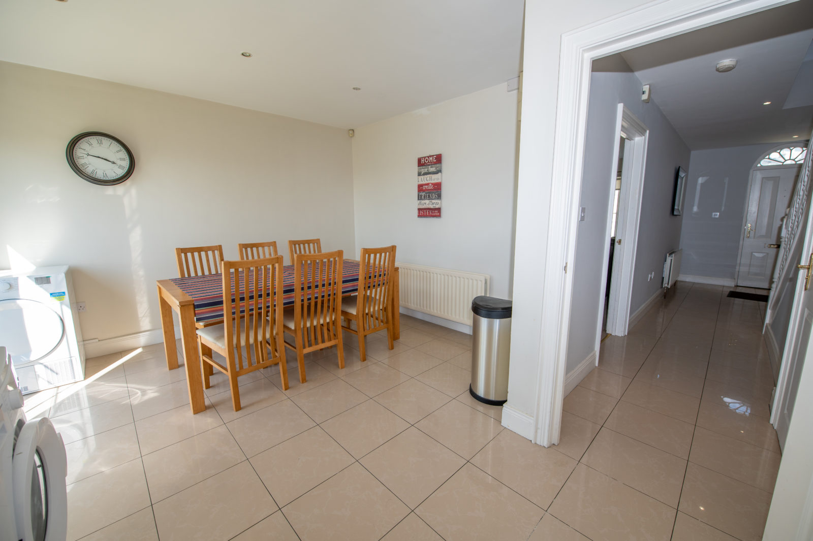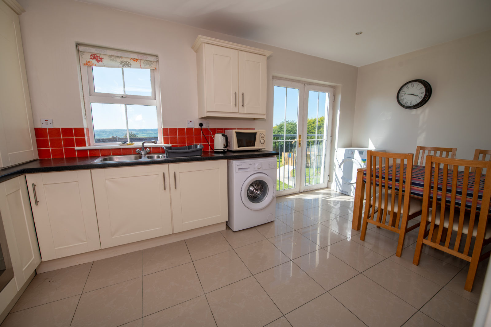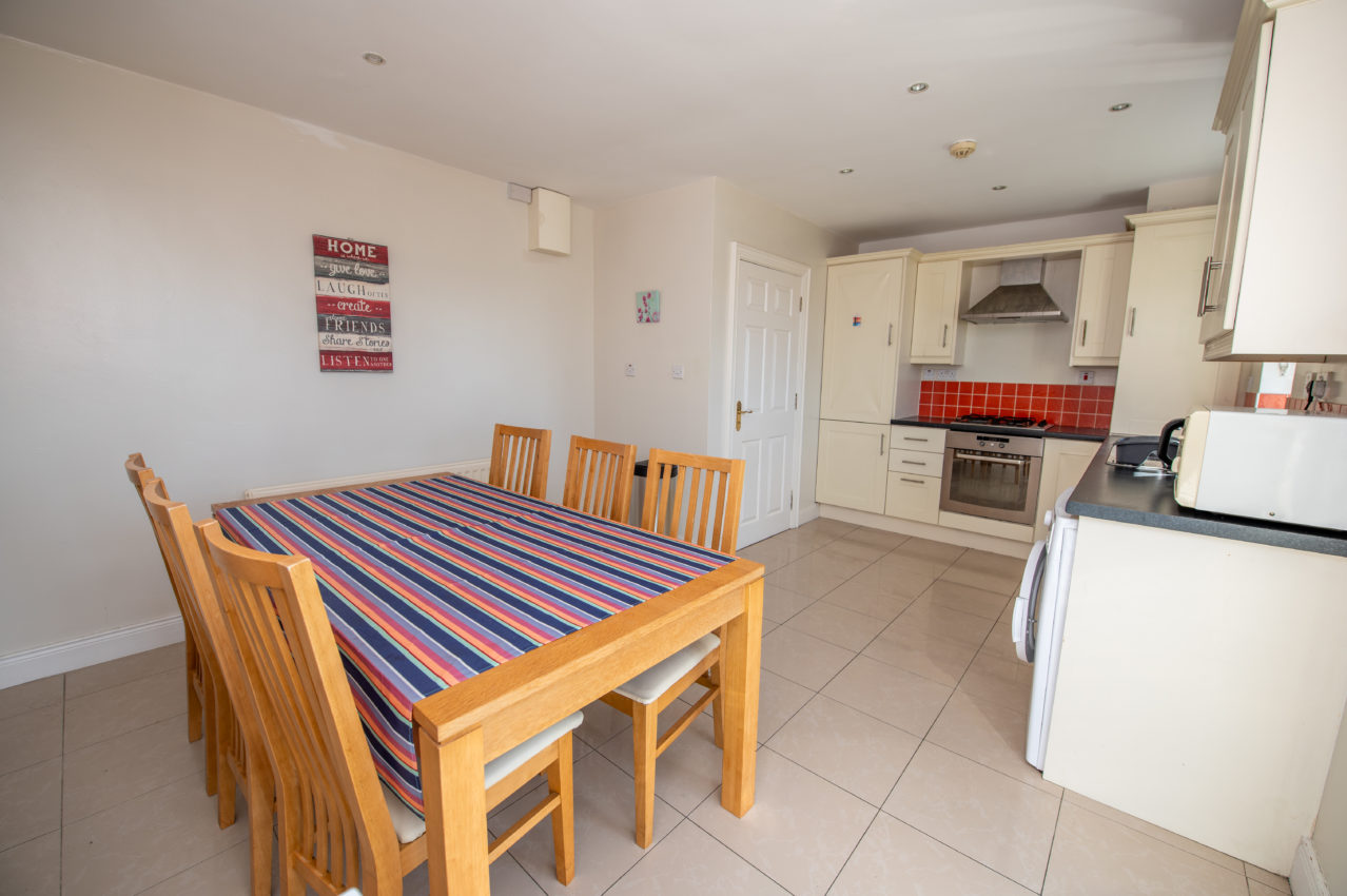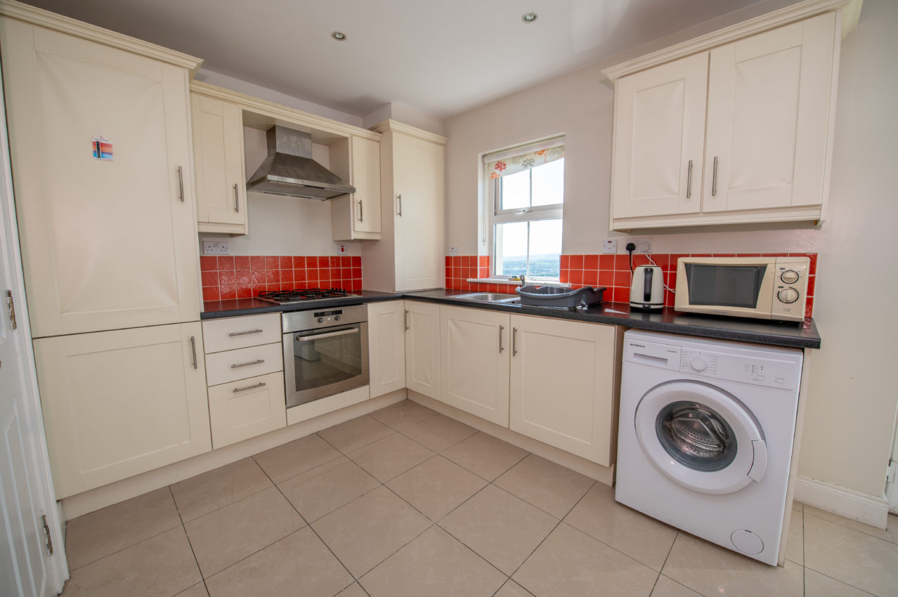 Kitchen/Dining Area; 3.62m x 5.21m comprehensively equipped with stylish shaker-style wall & base units, tiled splashbacks to the work surfaces, stainless steel single drainer sink unit with separate waste bowl, four-ring gas hob, integrated oven with stainless steel extractor fan over, Integrated fridge/freezer, plumbed for washing machine, tiled floor throughout, recessed lighting, fully glazed French doors to far-reaching views over Letterkenny town & the surrounding green area