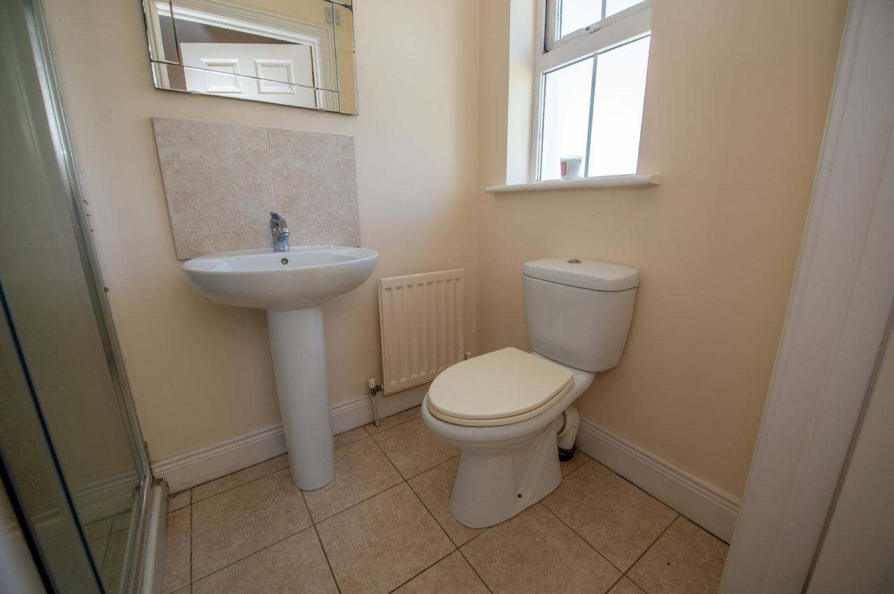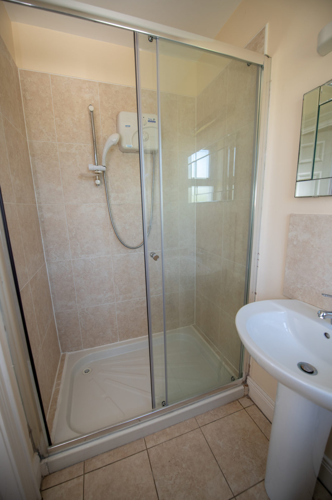 En-suite; white 2 piece suite and separate fully tiled shower enclosure with electric Triton T90, tiled floor & tiled splash back to wash hand basin