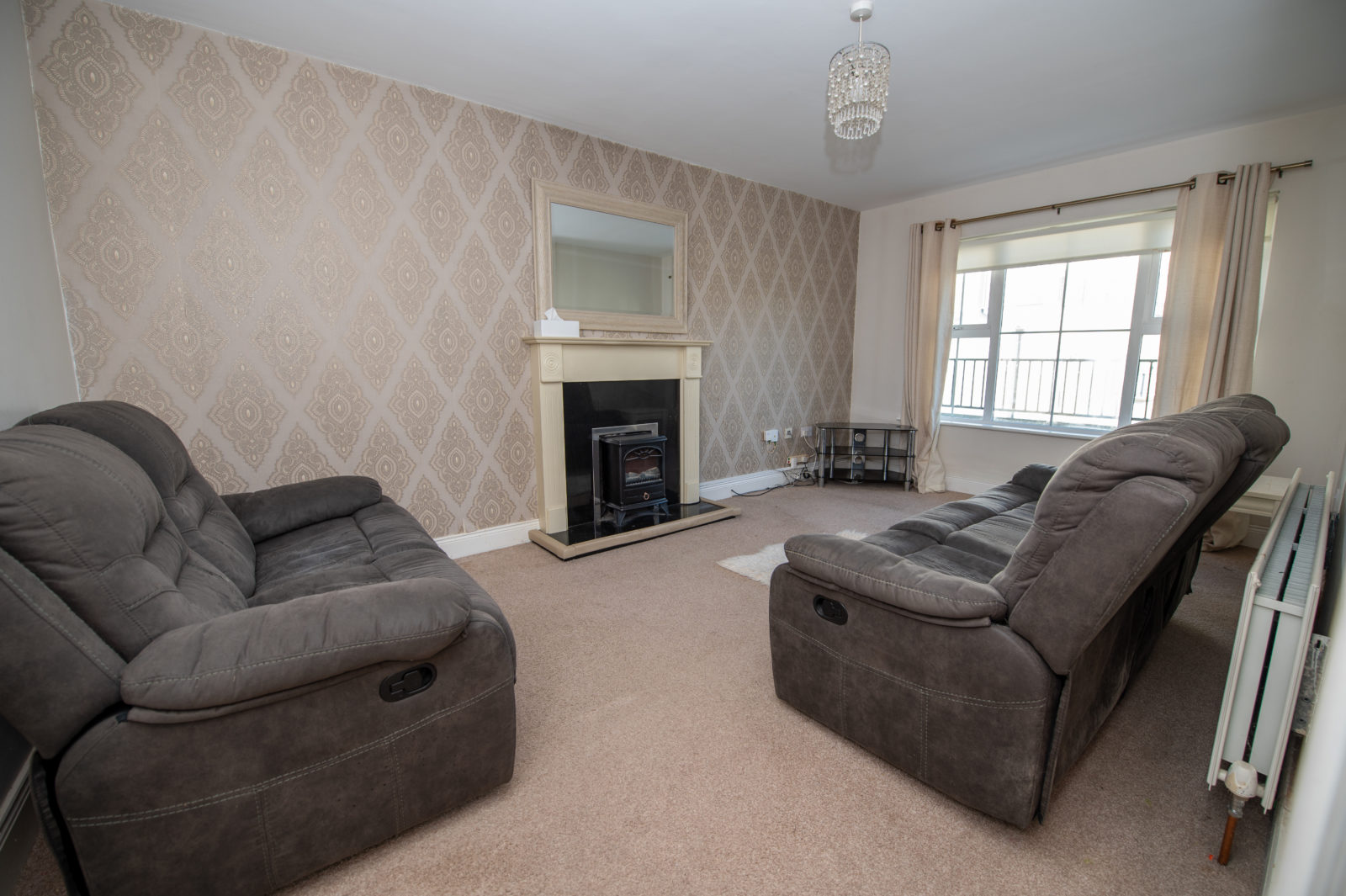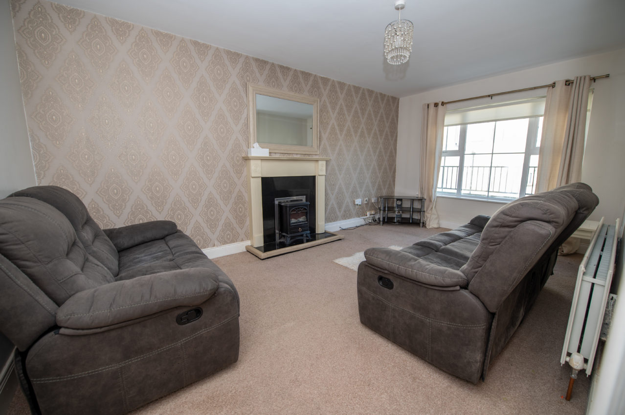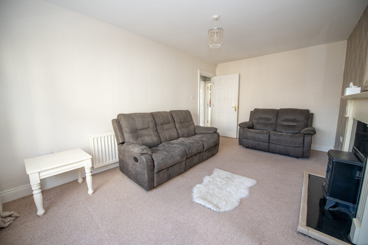 Living Room; 5.06m x 3.08m generous in size, carpet flooring, painted timber fireplace with granite inset & hearth with an electric fire, TV point, large front-facing window that provide natural light & views over the green
