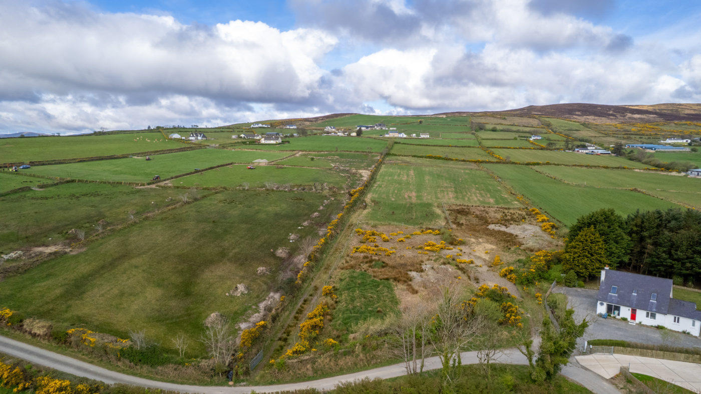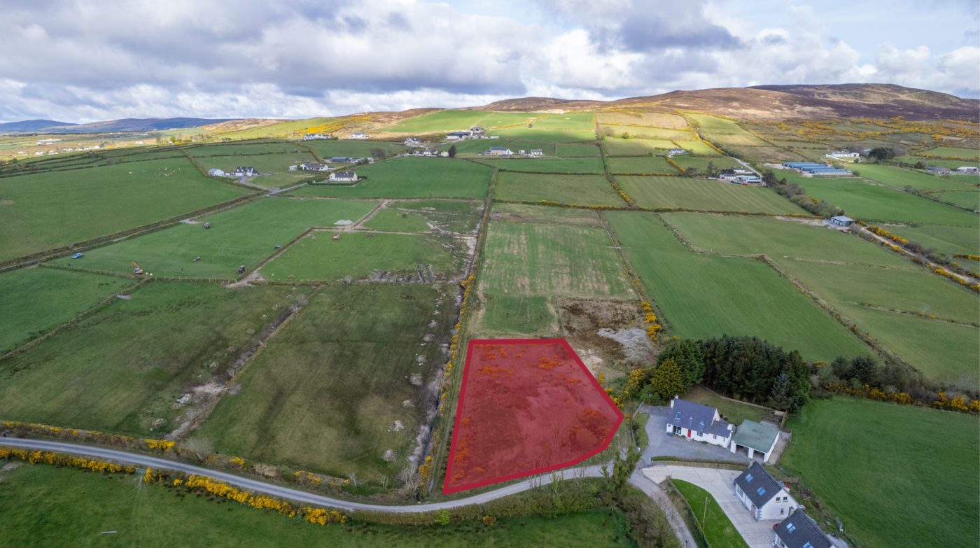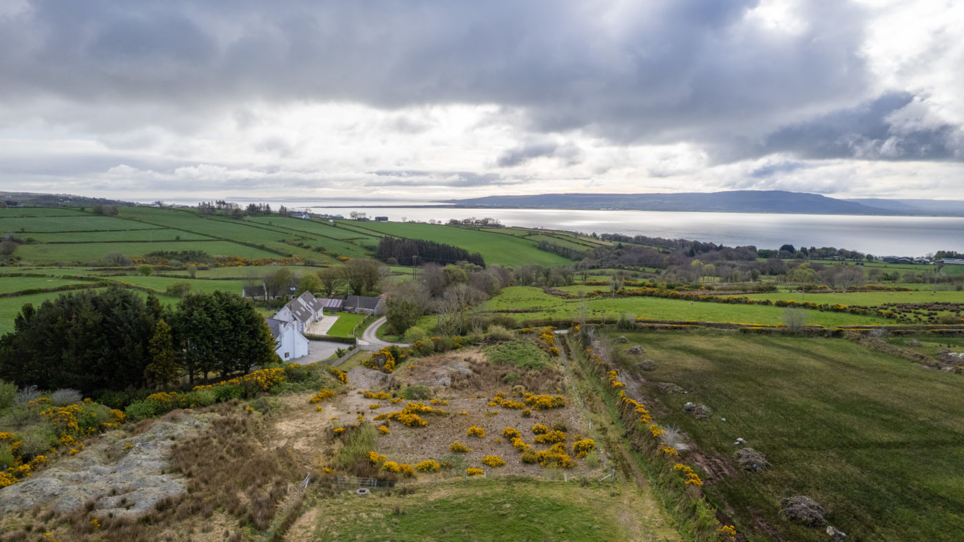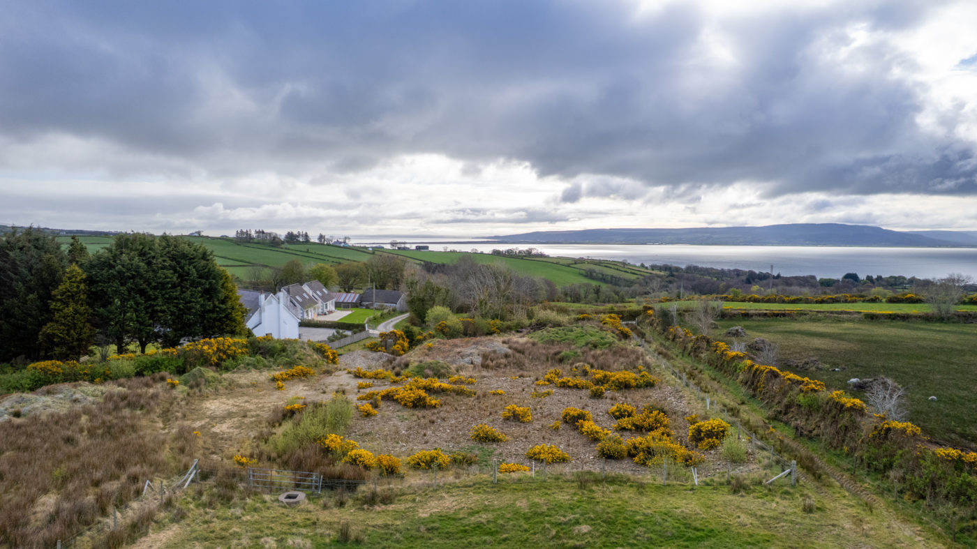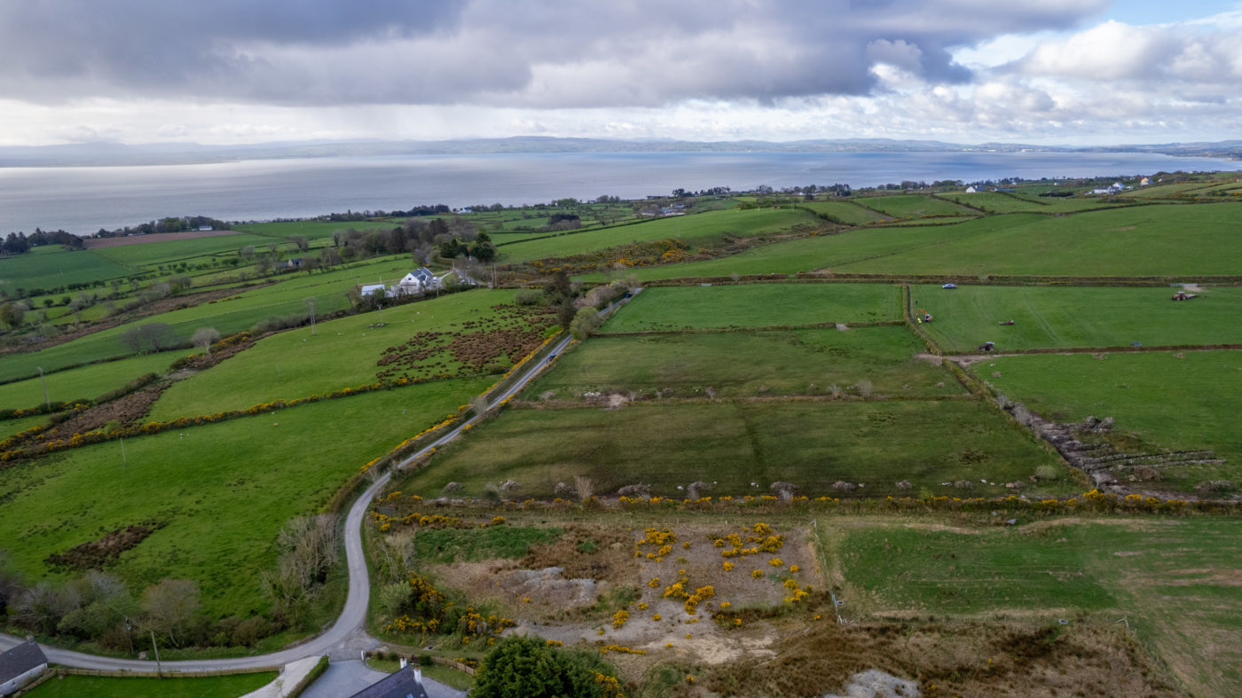 From Moville proceeded in the direction of Quiggley‘s Point for 1.5km and turn right into the Ballylawn Road. Continue for 2km and turn right at a small cottage on the corner and continue along this road for 300 meters in the site will be found on the left-hand side identified by Franklins ‘For Sale’ sign