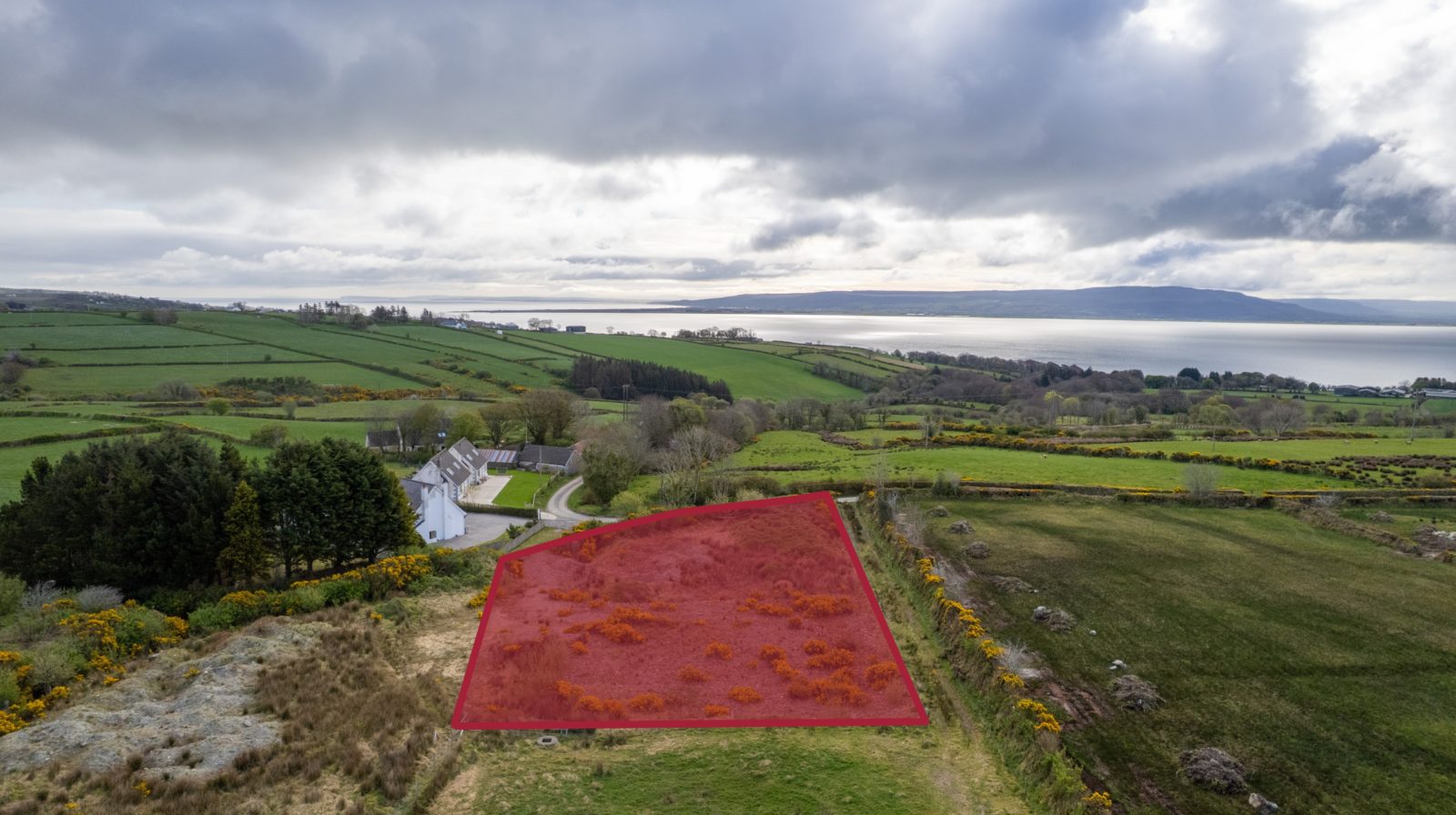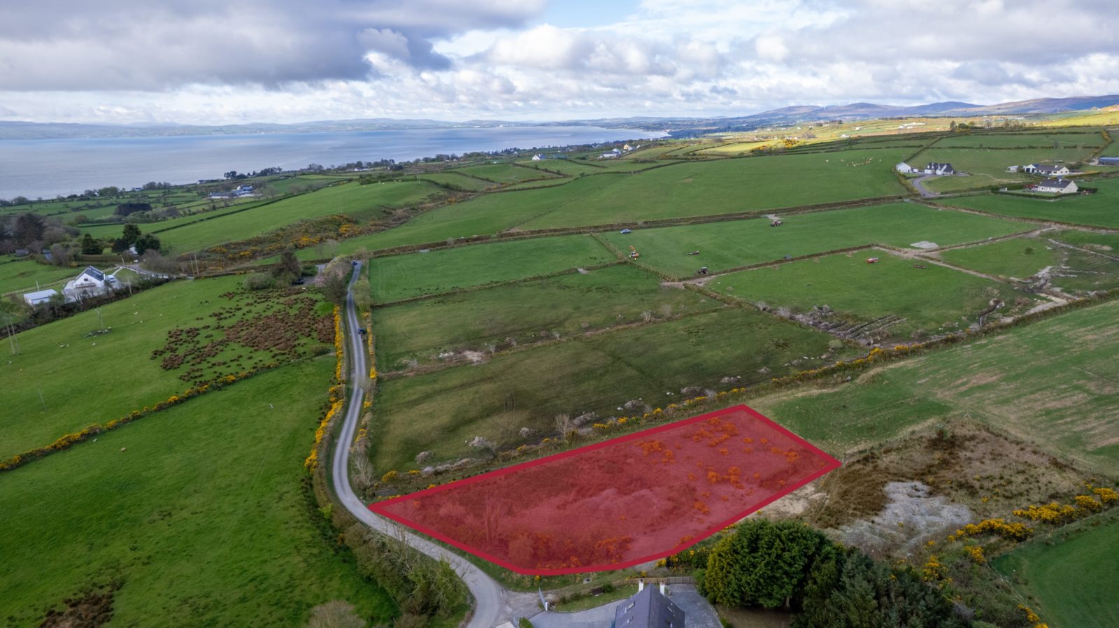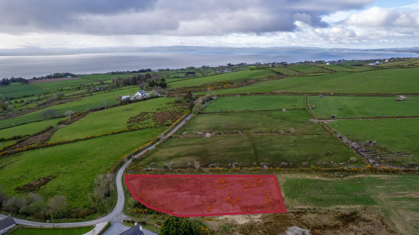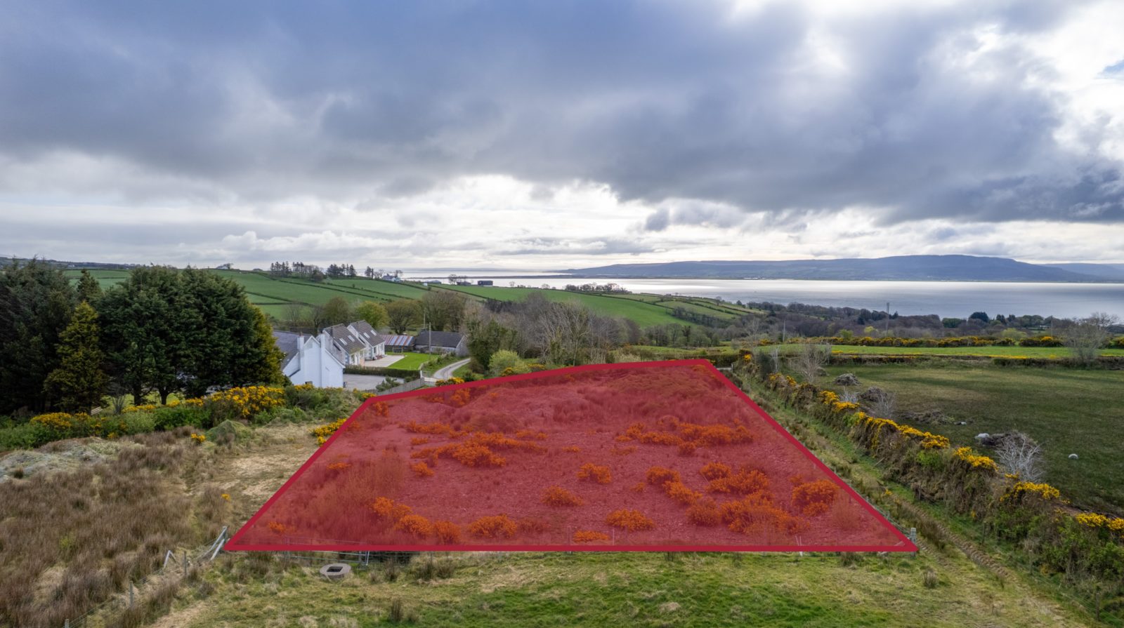 From Moville proceeded in the direction of Quiggley‘s Point for 1.5km and turn right into the Ballylawn Road. Continue for 2km and turn right at a small cottage on the corner and continue along this road for 300 meters in the site will be found on the left-hand side identified by Franklins ‘For Sale’ sign